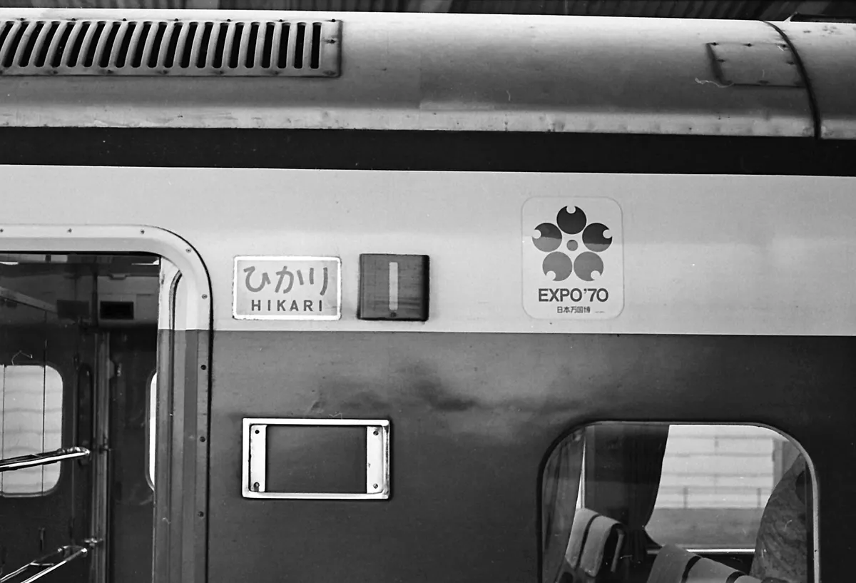 3枚目は1970年の大阪万博ステッカーで、1号車の脇の「ひかり」表示枠には開通当初は「座席指定」や「自由席」のサボが、下の空枠には「超特急 ひかり1号 新大阪」のサボをいちいち入れ替えていました。