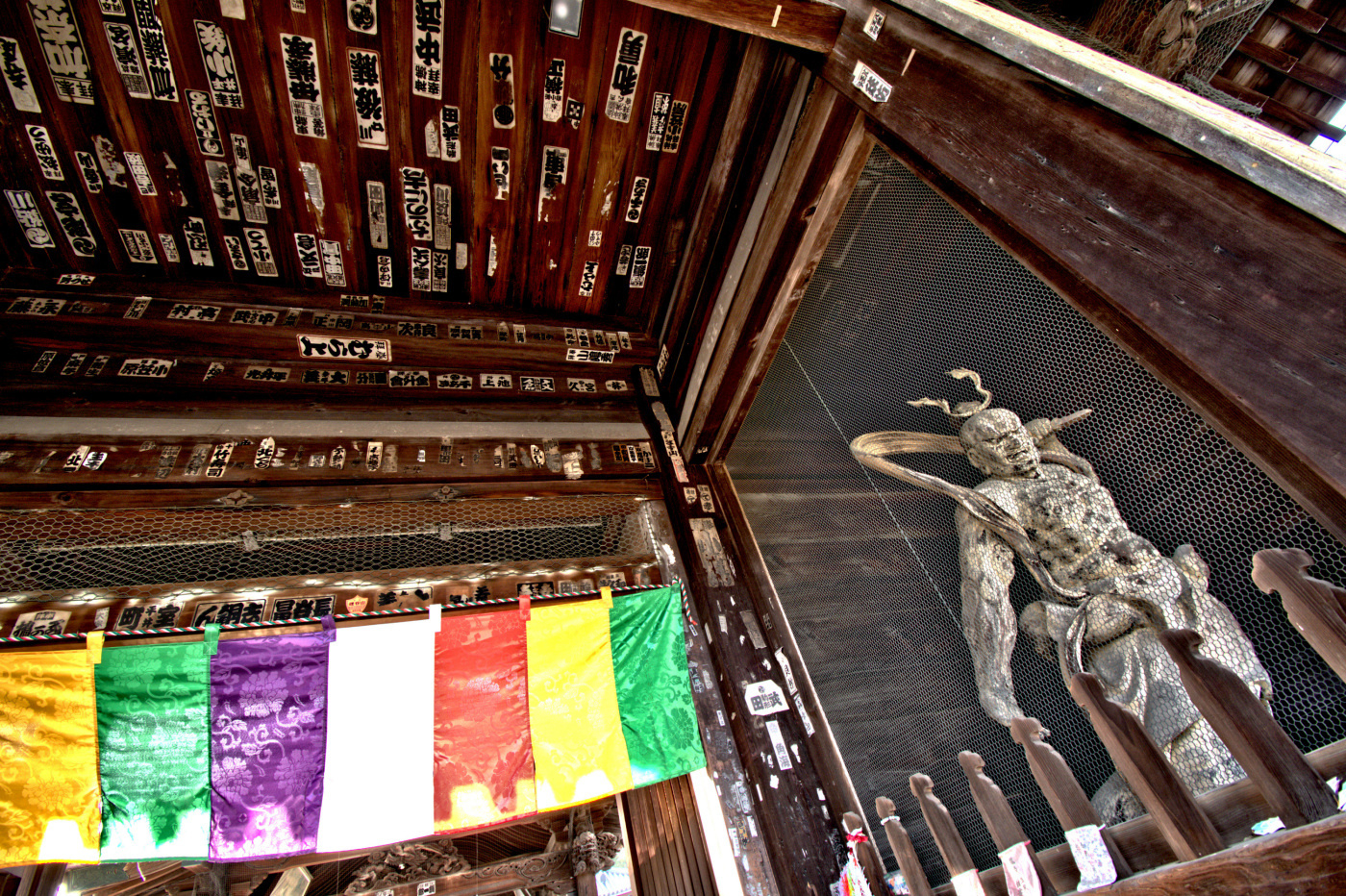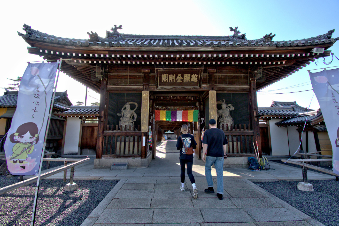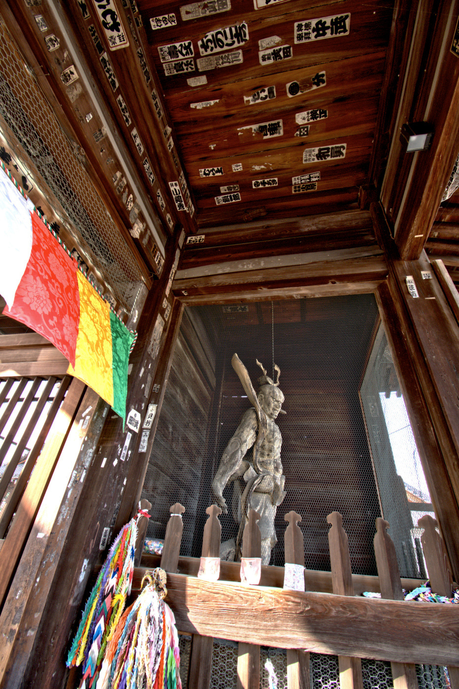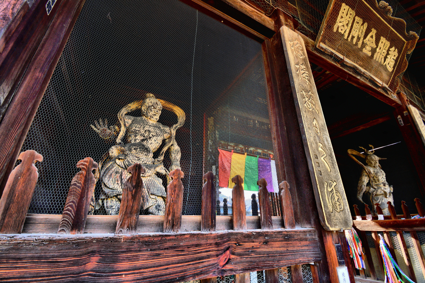 西院(誕生院)の正門。門の正面左右には金剛力士像(仁王)が立ち、西側には大草履が奉安されています。現在の建物は明治22年(1889)の再建ですが、金剛力士像は南北朝時代・応安3年(1370)の製作です。この仁王門前の石橋は、昔は毎月20日にのみ通行できたということから「廿日橋(はつかばし)」と呼ばれています。