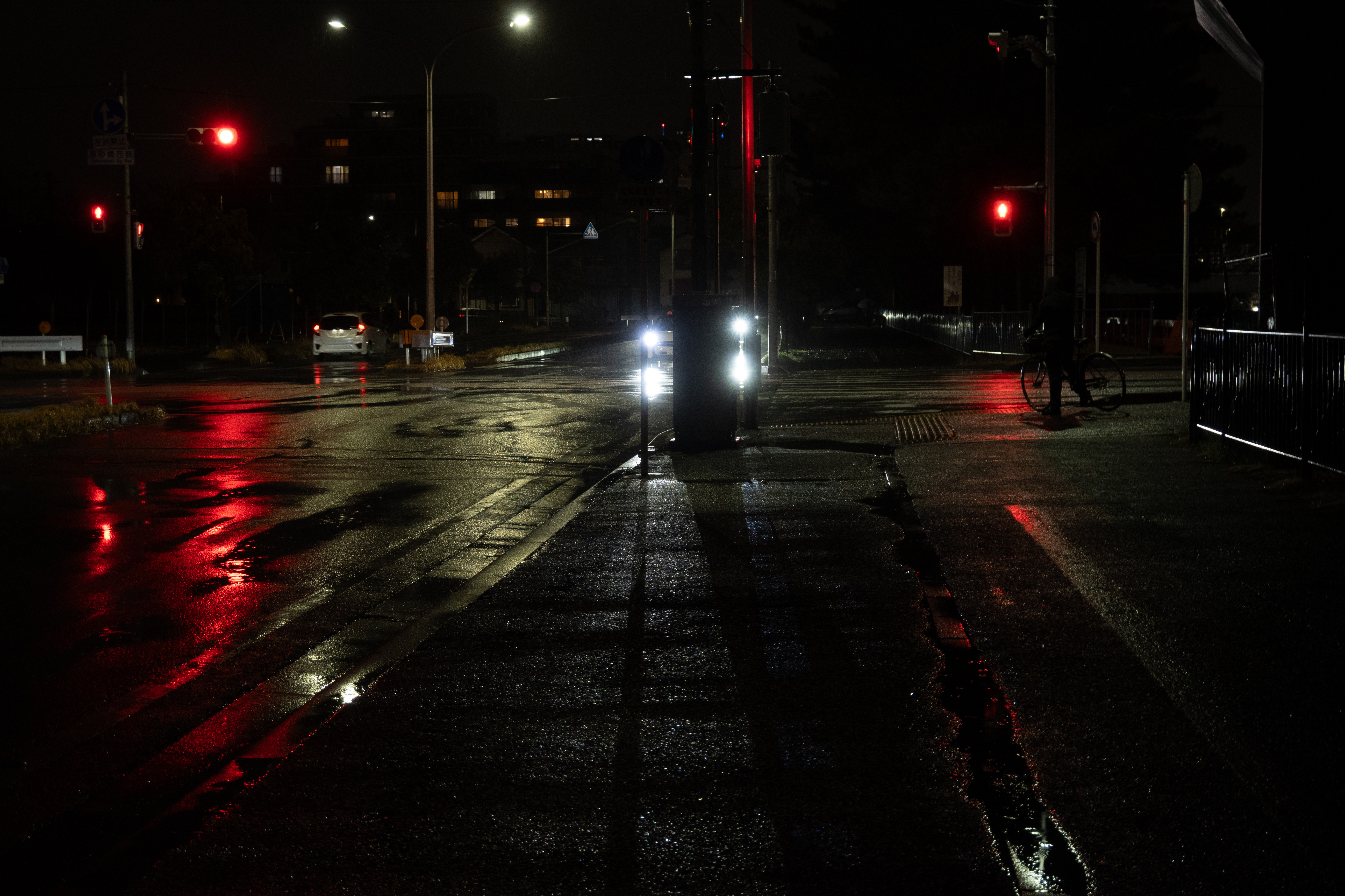 暗闇の中、わずかに濡れた道路が見えるところに、