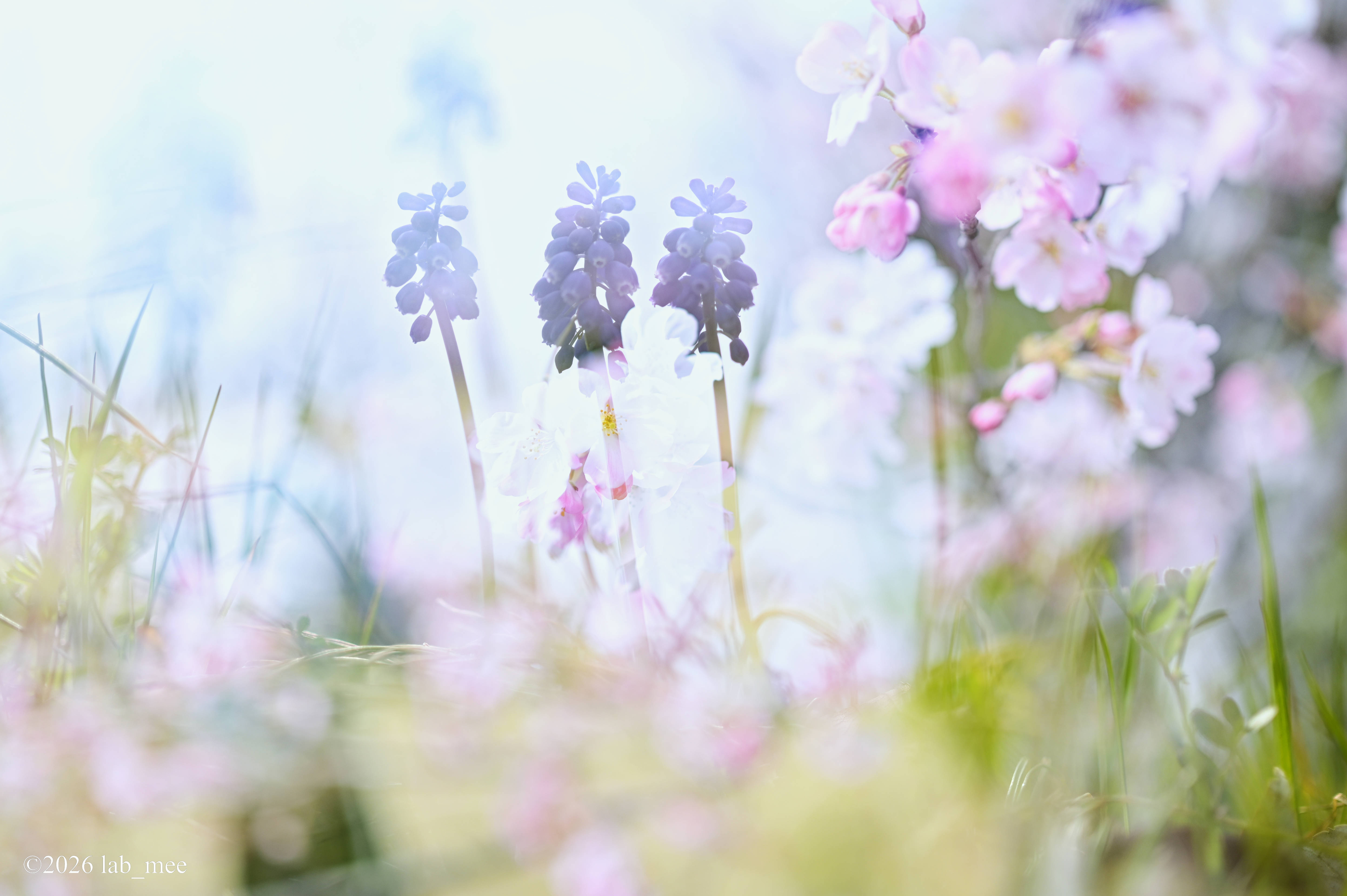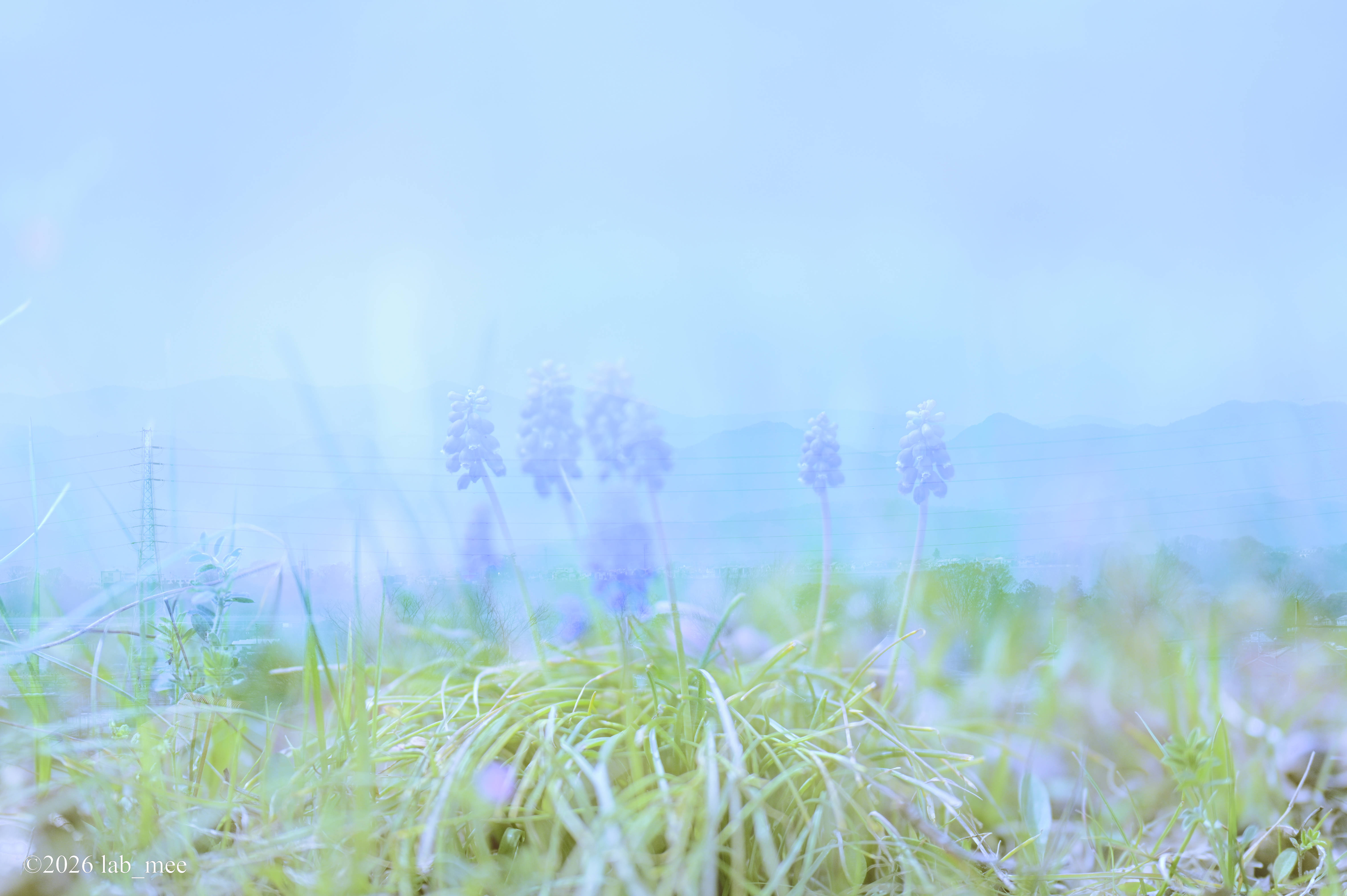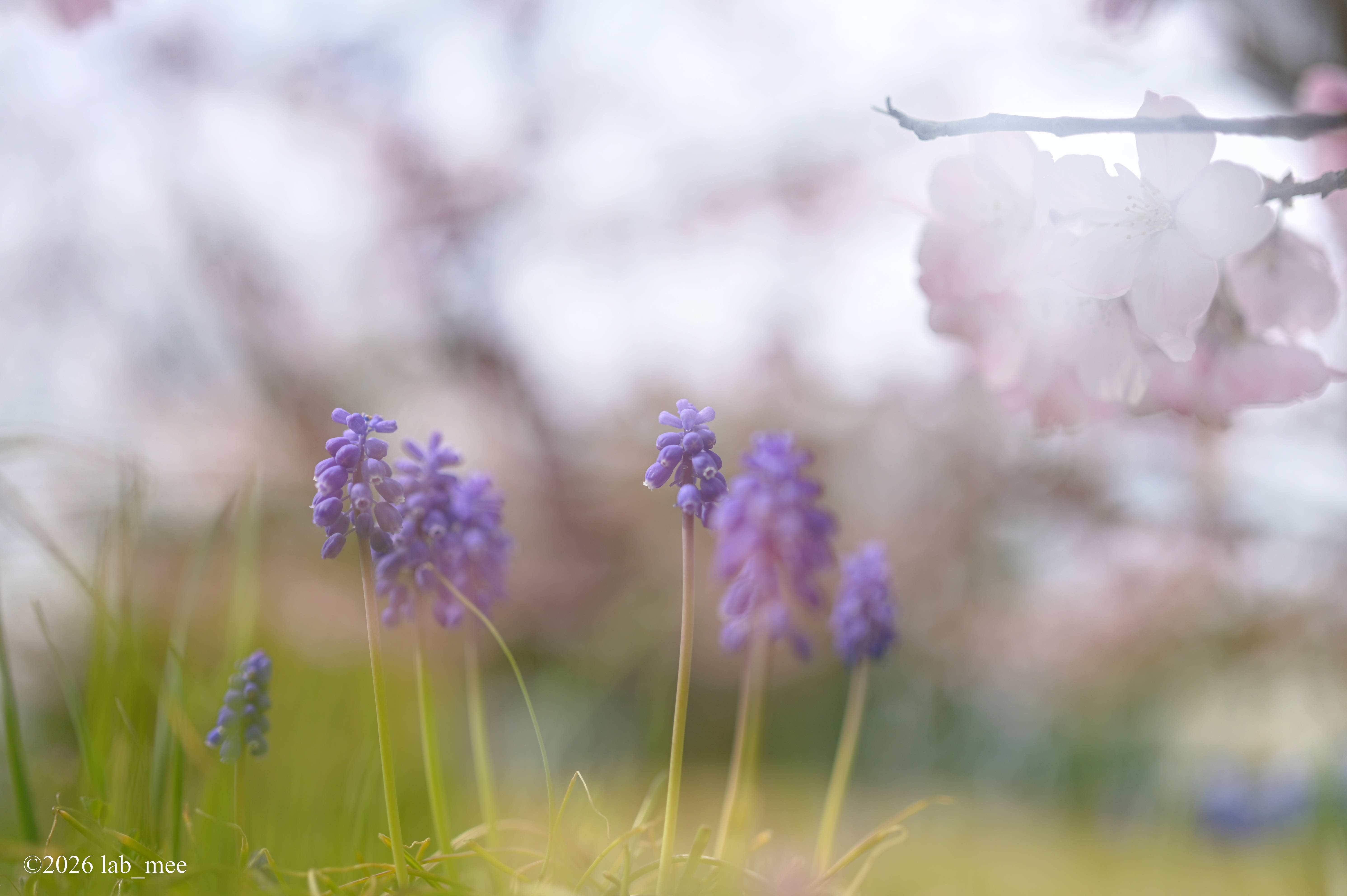 ムスカリを見上げるくらいの低さから撮るのは大変そう、などと無粋なことを考えてしまいました。(^^;