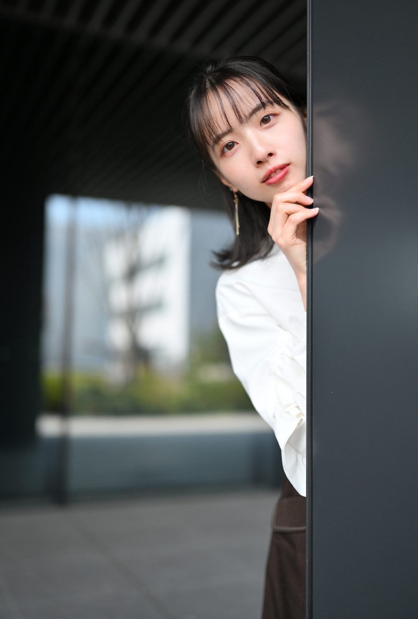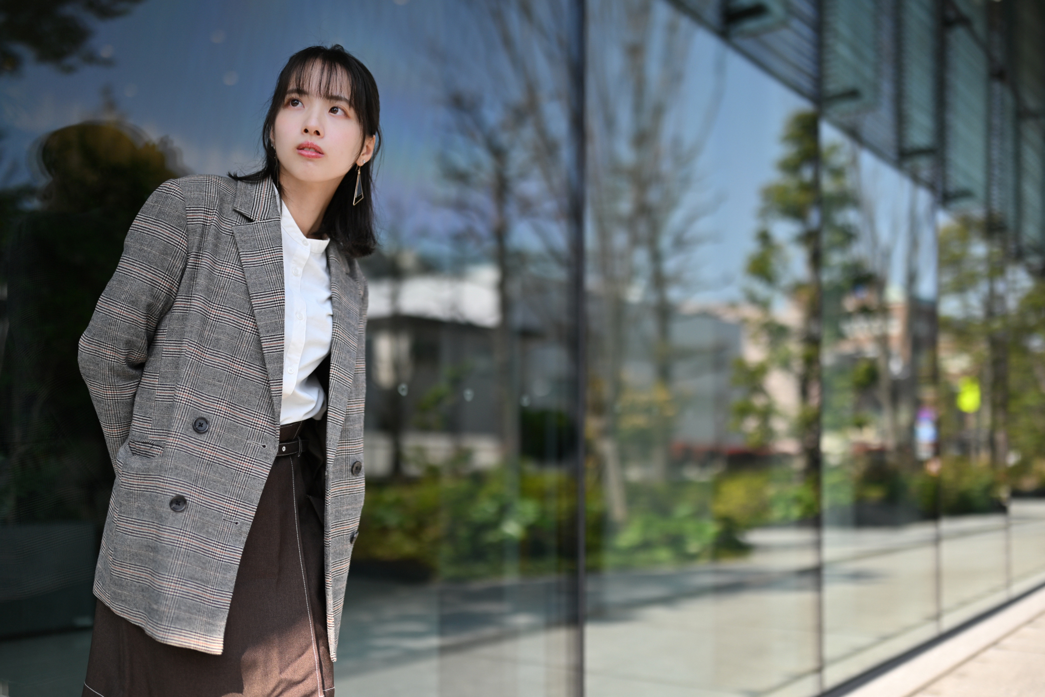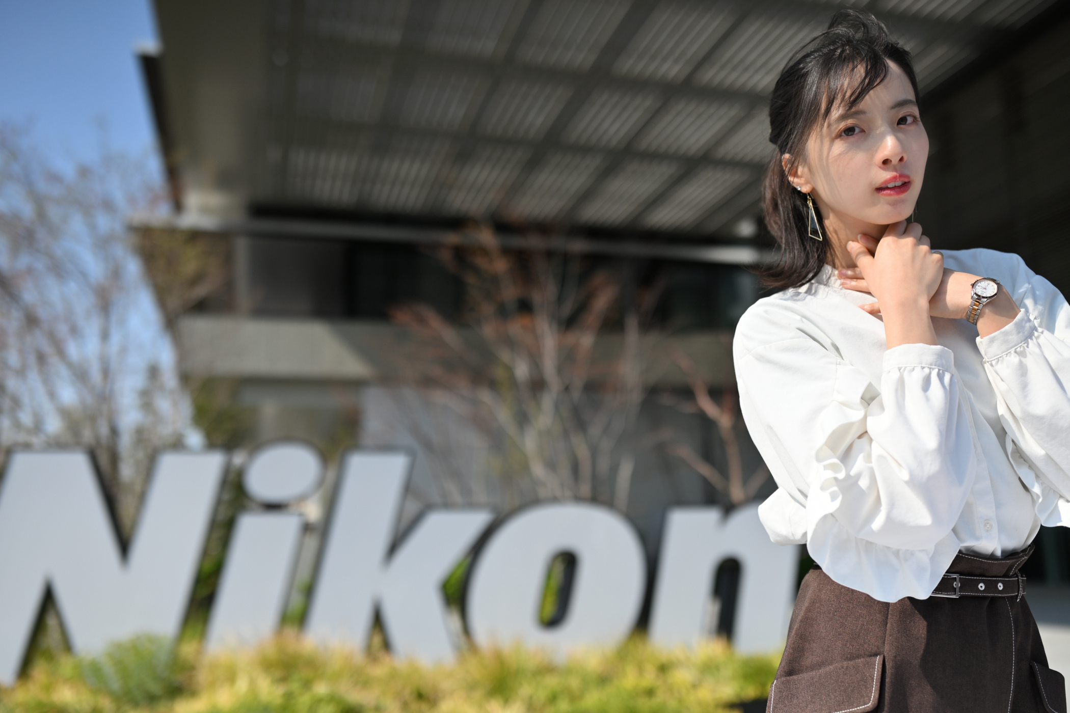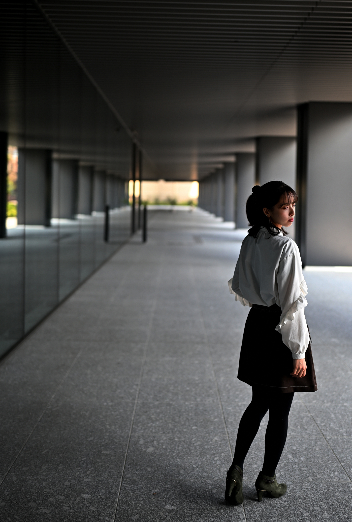 ポートレート撮影はニコン本社のオフィスビルと藍さんの雰囲気と洋服が見事にマッチ。有能なオフィスレディーが商談を成功させて顧客をルンルンで送り出したイメージで撮影しました(笑)。
