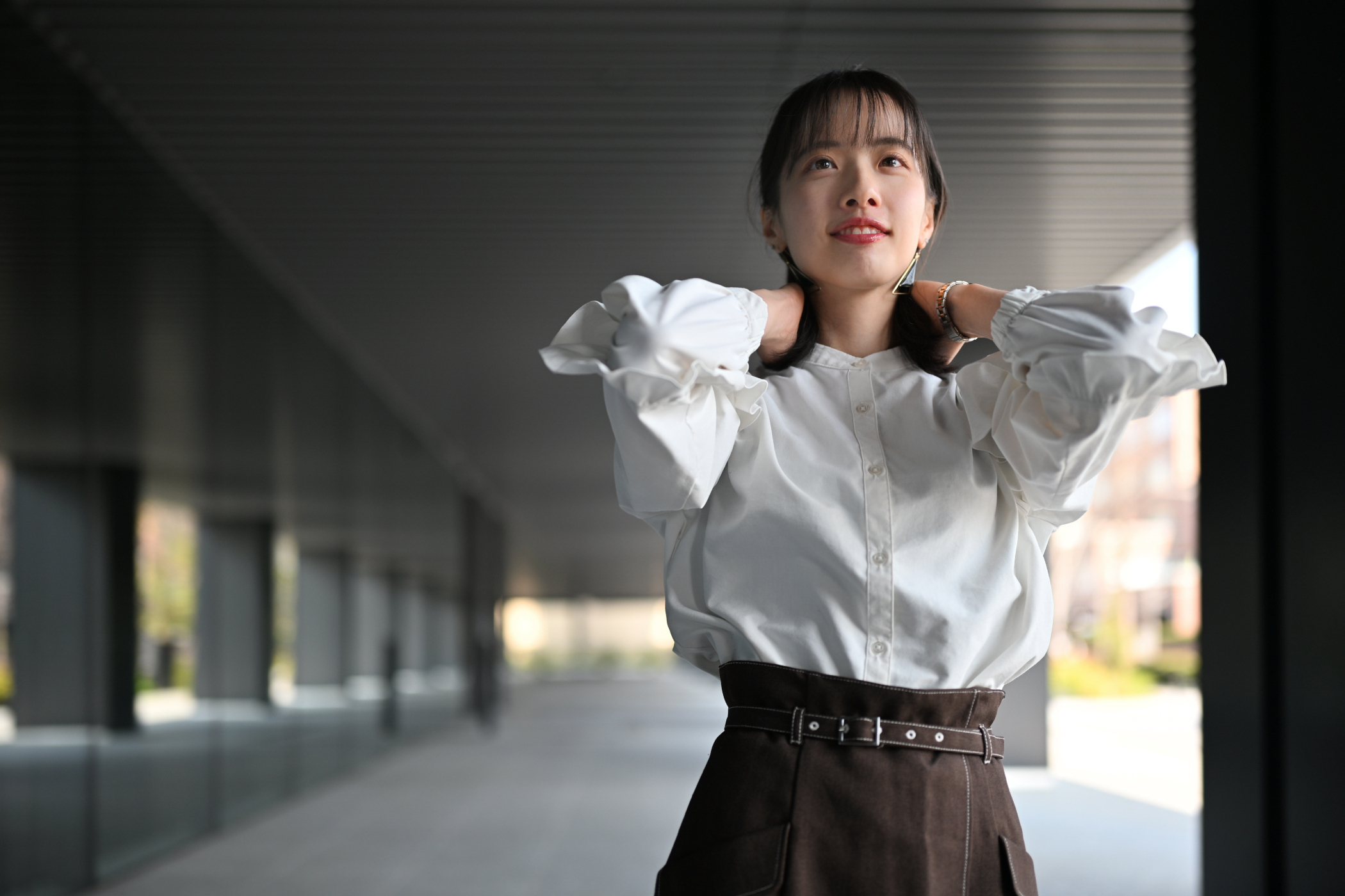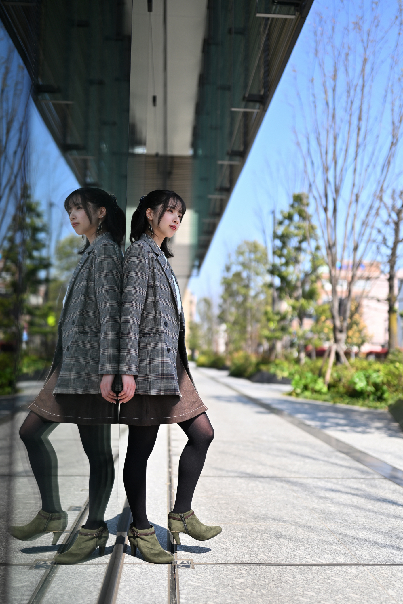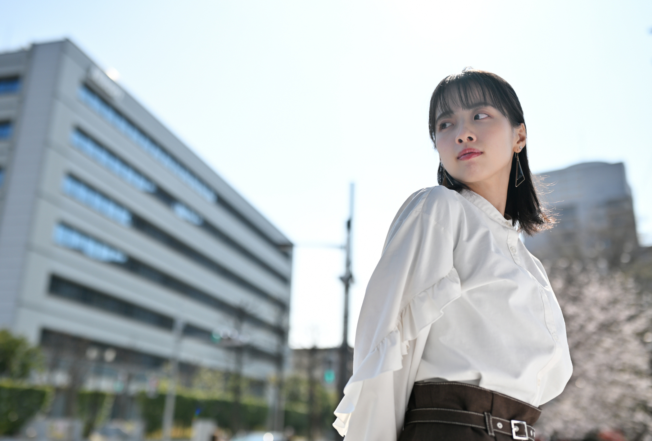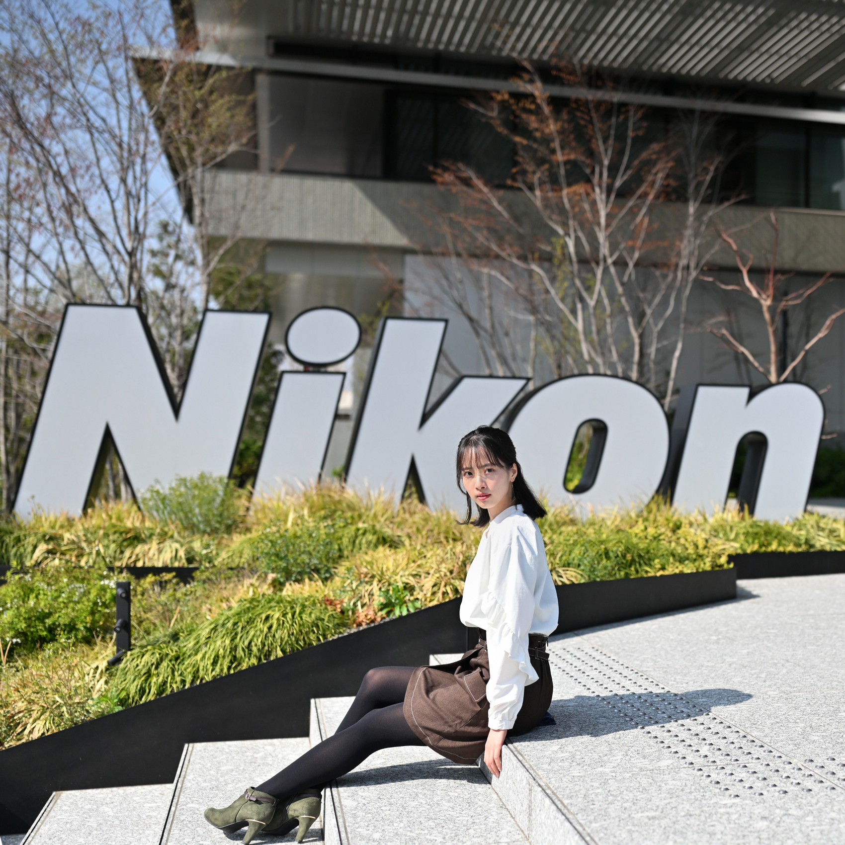 ポートレート撮影はニコン本社のオフィスビルと藍さんの雰囲気と洋服が見事にマッチ。有能なオフィスレディーが商談を成功させて顧客をルンルンで送り出したイメージで撮影しました(笑)。
