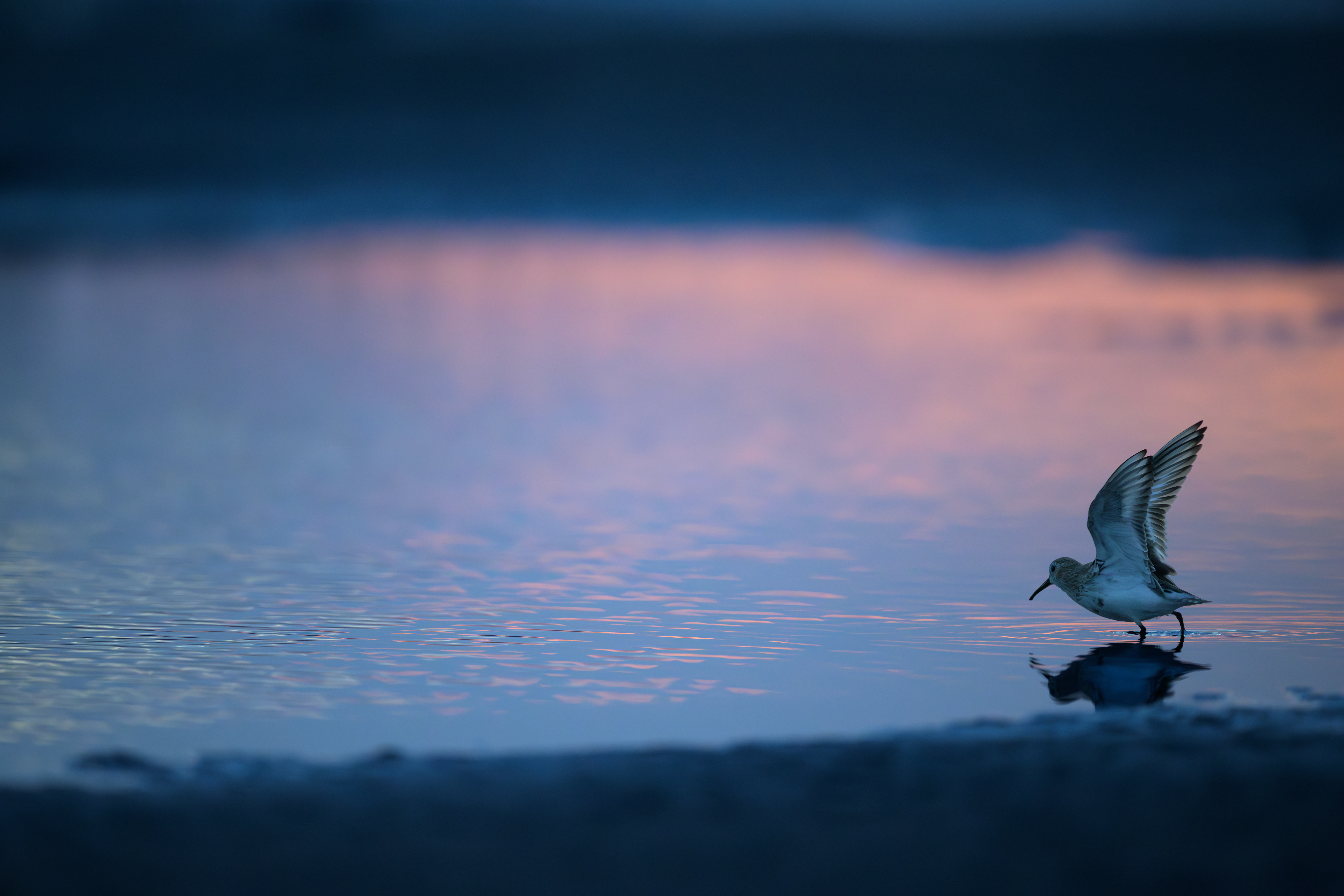一羽のハマシギの飛び立ちの瞬間をとらえました。左の空間が広くなりましたが、レフレクションが美しかったので敢えてノートリミングとしてみました。