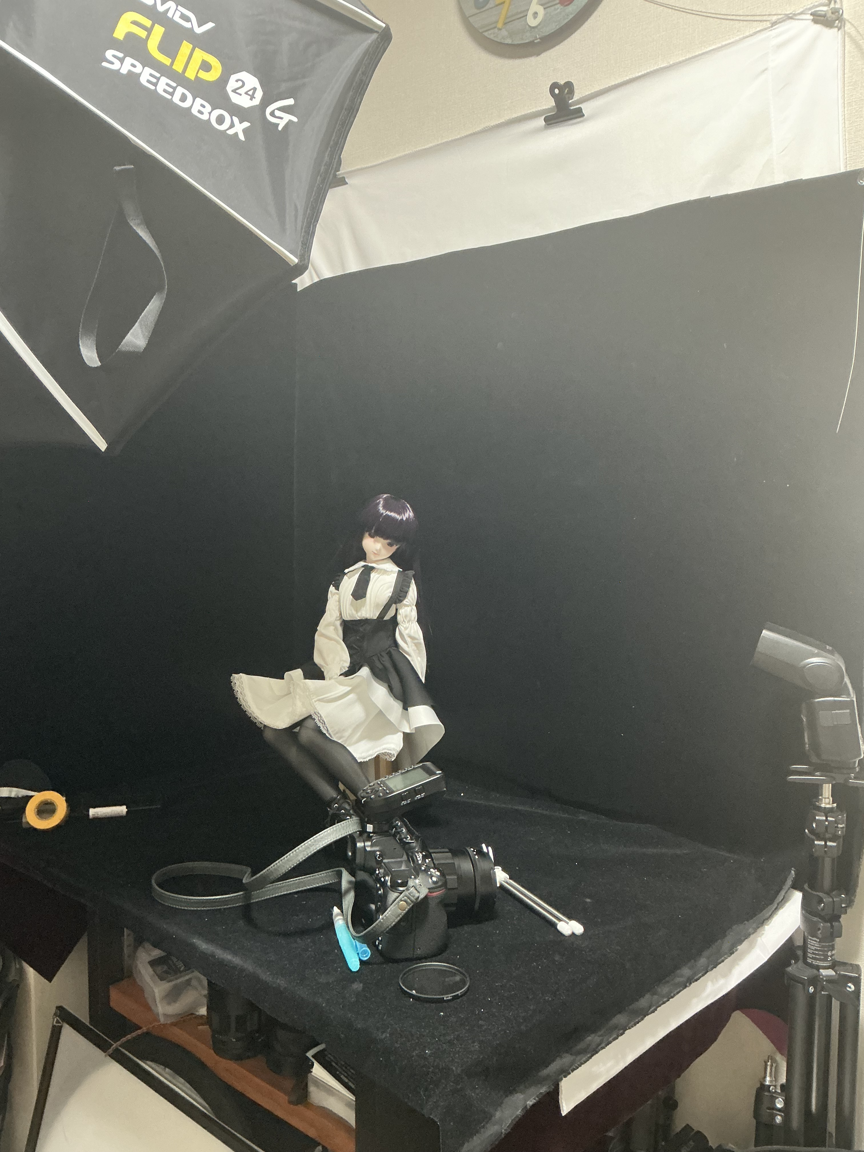 トップ > メンバーズ・フォト > その他 > わたしの作業部屋…というかお家スタジオ かぐぺろ 2026/04/02 00:08 わたしの作業部屋…というかお家スタジオ 折角なのでハッシュタグを付けてみました。 縦80幅90奥60。黒布は暗素研の無反射植毛布を使用しております。 写真の娘は立ち姿で約60cmあります。 常設ストロボ3灯+ピント合わせ用のLED1灯。撮影時は部屋の照明は消しております。 ソフボ、白黒銀透過レフ等々撮りたい画によって適宜使用するといった様子です。 ライティングで遊ぶにはそれなりに整えられたかなあと思っています。 わたしの作業部屋 いいね 共有する 共有する X facebook LINE リンクをコピー コメントする 2 件の返信 (新着順) ミュートしたユーザーの投稿です。 投稿を表示 nicolas 2026/04/02 13:24 かぐぺろ プロフェッショナルなスタジオをお見せいただきありがとうございます。 ドールが意外?に小さくて驚きました。ライティング調整やピント合わせが難しそうですね! いいね 返信する ミュートしたユーザーの投稿です。 投稿を表示 かぐぺろ 2026/04/04 20:22 nicolas 60cmはなかなか存在感がある大きさではあります笑 ピントは意外と合いますよ! いいね 返信する ミュートしたユーザーの投稿です。 投稿を表示 yumem 2026/04/02 07:14 暗素研の無反射植毛布って良さそうですね。 自宅の六畳間(現在倉庫代わり)を使って簡易スタジオ作ろうと考えていますので、諸々参考にさせていただきます。^^ いいね 返信する ミュートしたユーザーの投稿です。 投稿を表示 かぐぺろ 2026/04/04 20:20 yumem 少しお高いですが、黒背景で撮られるのであれば撮影し易いのでおすすめです! もっと黒い製品もありますが、流石にオーバーかなと思いました笑 いいね 返信する
