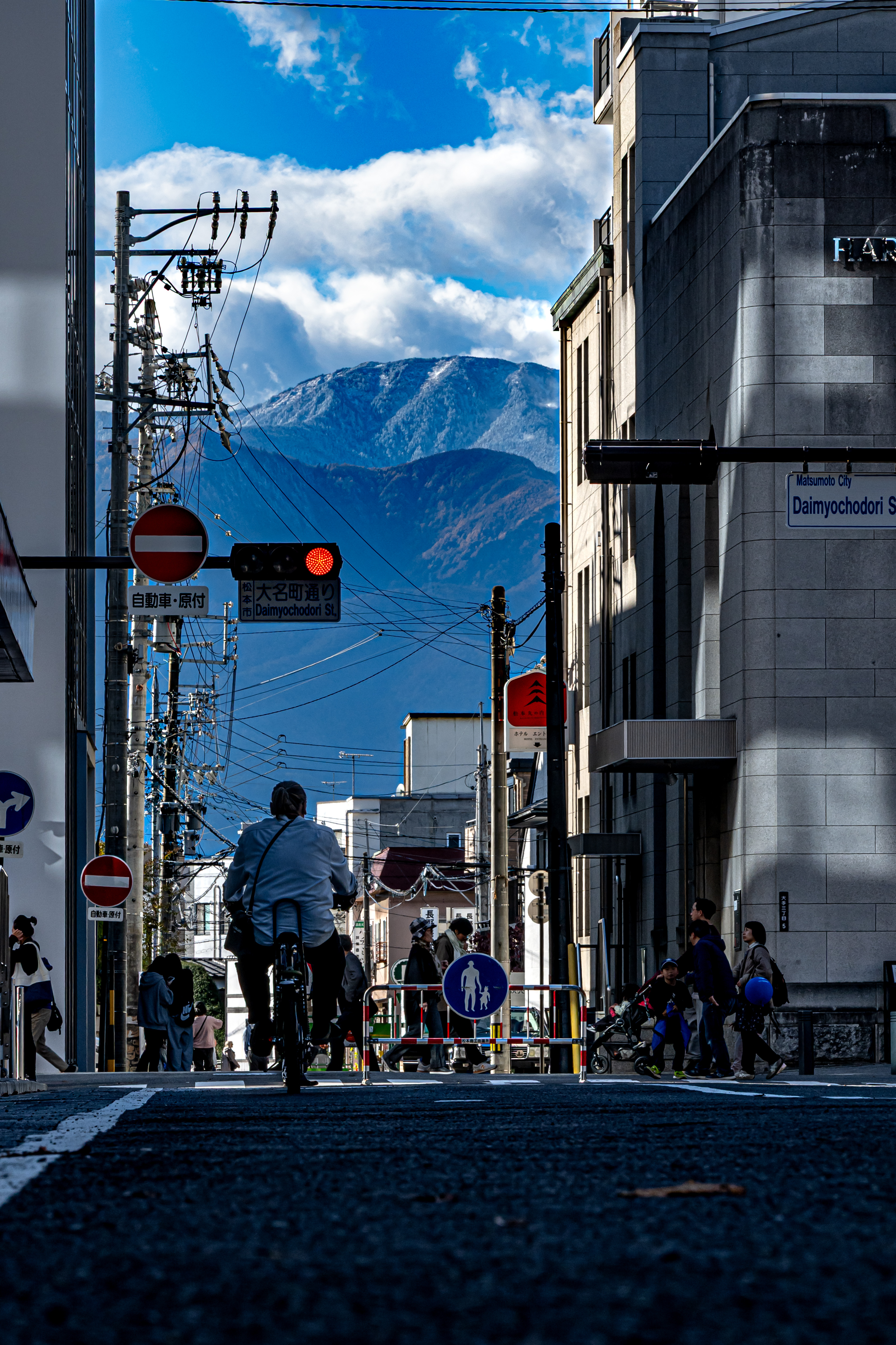 松本市内、ビルの谷間の向こうに少し雪化粧した北アルプスがありました。「関西では見られない光景だよな。。。」と思いながらシャッターを切りました。