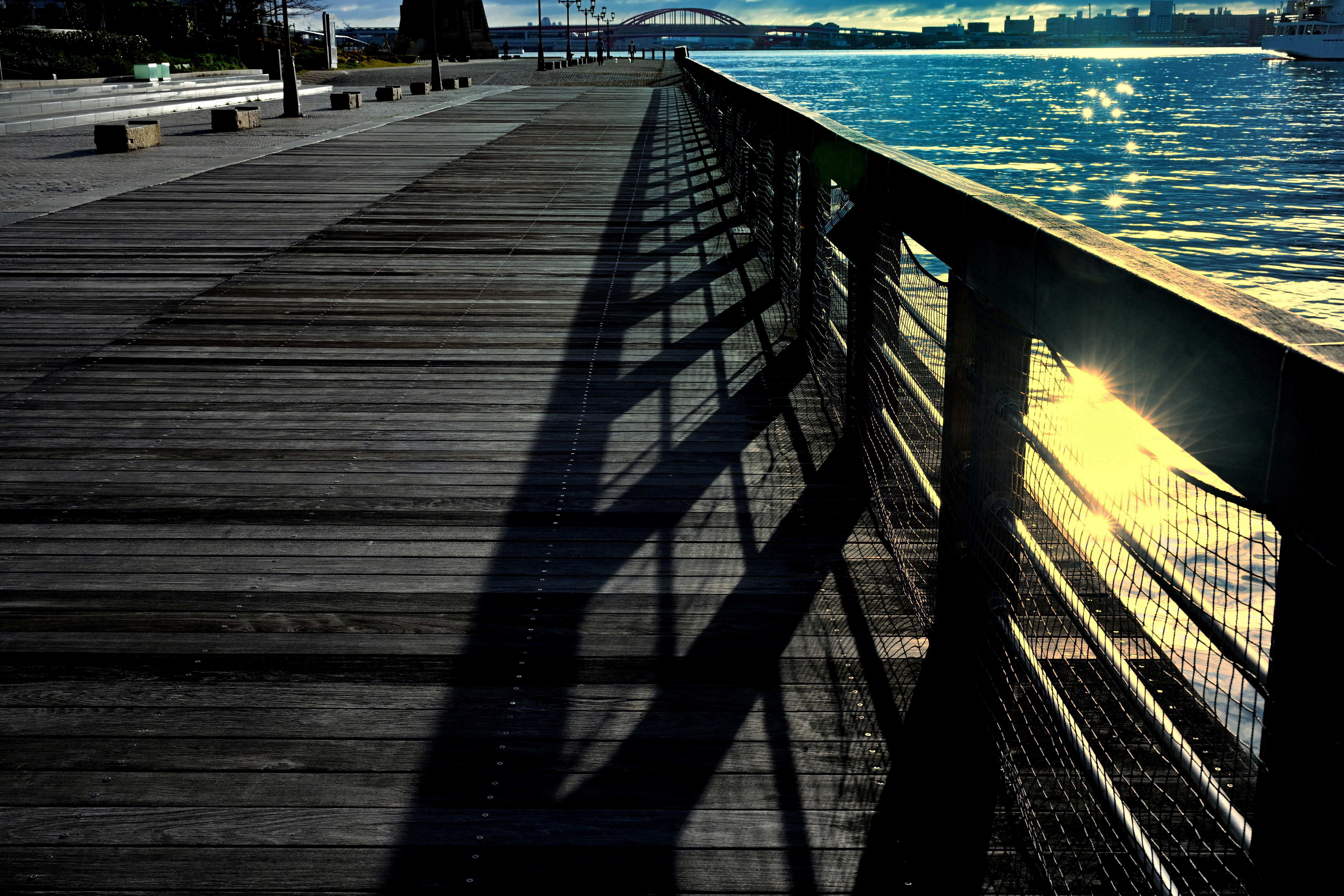 投稿を表示海に散らばる光と奥行きを感じる柵の様子にウッドデッキへ影を落とした光景が素敵ですね。^^