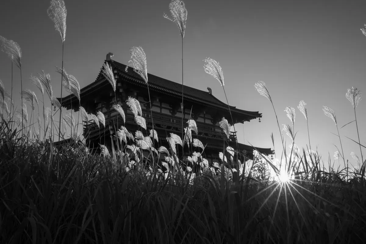 投稿を表示夕暮れ時の朱雀門とススキ、そして夕日の光芒が綺麗です。カラー、モノクロともに素晴らしいです。