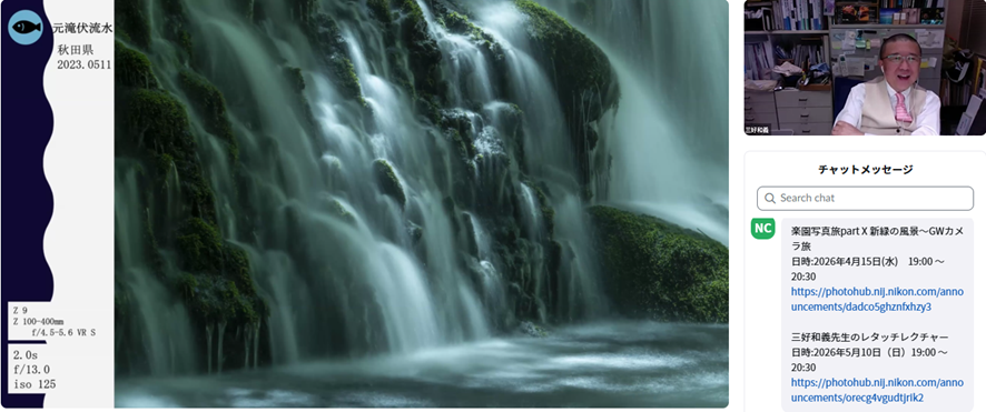 三好先生によれば、鳥海山の伏流水が湧き出す元滝は写真愛好家に人気のスポットです。紹介された作品は望遠レンズで撮影されていますが、手前の流れを入れるために広角で撮るのも良いとのこと。撮影にはND64フィルターを使用し、上からの光が立体感を出している作品でした。晴れの日だけでなく曇りの日でも良い写真が撮れるのでおすすめだそうです。