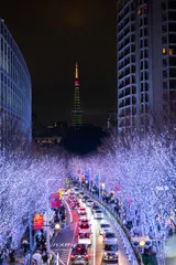 2025年12月24日。聖なる夜のけやき坂。雨の中多くの人達がこの巨大なクリスマスツリーを見に訪れました。賑わう街のとこの幻想的な青い光がみんなを絵がにさせました