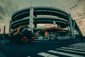 大阪市大正区、新木津川大橋 大阪市大正区と住之江区を結ぶ「新木津川大橋」の大正区側・大正区側は見ての通りループ橋(3回転して登るので、車の場合慣れないと目が回ります)・住之江区側はなだらかな直線歩いても渡れる(今回は歩いた)が、橋の袂には未だ「渡船」が現役で残っている