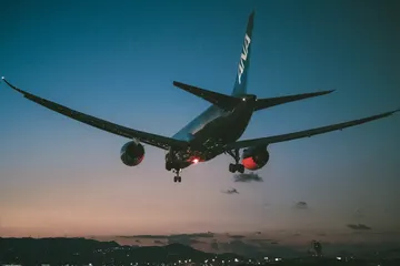 紅葉に飛行機を添えて 秋空を飛ぶ飛行機と紅葉