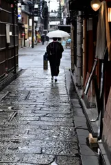 街角で出会った光景です。濡れた石畳に京らしい趣きを感じました。