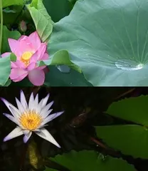 ハス、浮葉と立葉の2種類の葉っぱ水をはじき水玉のようになる 地下茎がレンコンスイレン、浮葉に切れ目あり水をはじかない 地下茎がワサビみたいなかたちロータスはハスブルーロータスは青い睡蓮、言葉がややこしい7/16蓮3/20睡蓮