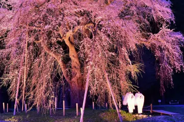 おしらさまの枝垂れ桜 以前撮影 D810/16-35mmf4G 絞り優先 f8 1.3秒 ISO100 ±0撮影地「小野小町の出たところ」と言われる秋田県湯沢市「小町」役のお姉さんが立ってくれます。