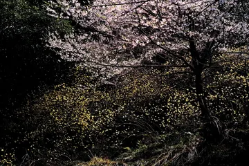 ミツマタ咲く丘 ミツマタが咲き、傍に早咲きの桜が彩を添えています。