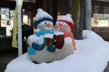 「仲良し」 きょうは、全国的にクリスマスですね、、、多分。市内の商店街で、仲良しの雪ダルマが、お土産を手に、今夜、皆さんの所へ行く準備をしています、、、(^O^)/