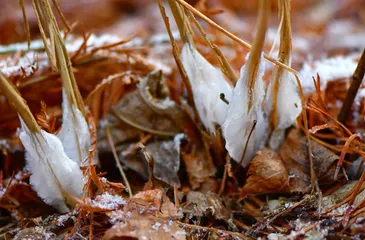 シモバシラ シモバシラという草に霜が付く現象です。何回か挑戦しましたが、昨日初めて見つけました。太陽が上がると消え去りますからチャンスが少ないのです。森林植物園の開園が9時ですから、大体解けてしまうのですが、この寒波のお蔭で撮影出来ました。