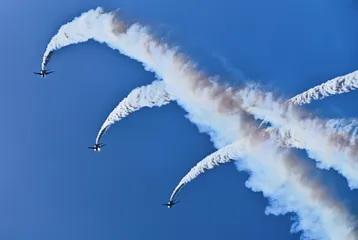 物凄い迫力ですね。この手の作品は沢山見ましたが、これは圧巻です。ダイナミックな飛行曲線を描く飛行雲。お見事です。