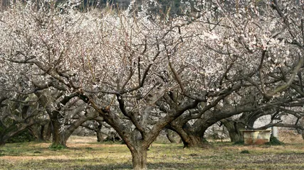 曾我の梅林:白梅 曽我梅林は、曽我丘陵の麓に広がる別所梅林・中河原梅林・原梅林の総称です。規模は約45ヘクタールあり、約3万5千本の梅が植えられています。梅酒用として白加賀、梅干し用として十郎、梅酒、梅干し兼用として杉田が主な栽培品種です。例年6月~7月初旬にかけて、380~400トンの梅が収穫されます。そんな事で美