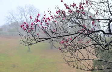 紅梅 雨が小降りになったので、梅の木が沢山ある公園へ。先ぶれのように花が開いていましたが、春らしい霧の中では十分でした。