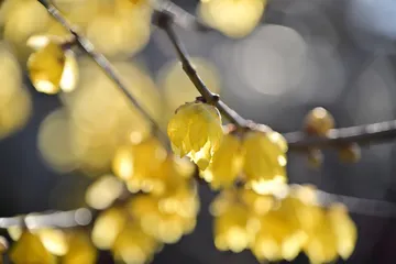 ほのかに光る 1月27日に撮影した亀戸天神の境内に咲いていた蝋梅です。午後の日差しを浴びてキラキラしている蝋梅の花はとても美しく見えました。