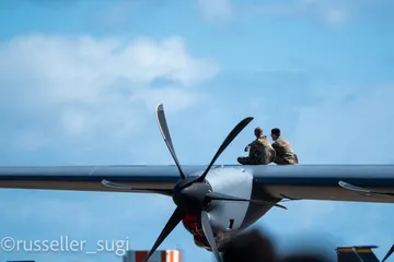 特等席 晩夏、青森の三沢航空祭にて。 三沢基地は米軍との合同基地となっており、日米合同航空祭となっていた。観覧飛行を求めて、私を含む多くの観客が人の頭ごしに観覧をしていたが、大型輸送機の主翼が観覧席になっており、まさに特等席といった感じである。 きっと自衛隊で同じことをやったら大問題にな