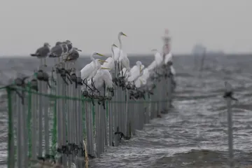 「待機」ダイサギ いつもの干潟でも天候や潮回りで鳥たちの行動は全く異なるから飽きることがない。満潮時、サギたちのお気に入りの休憩所だ。