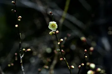 桃の節句には桃の花を模した赤く染めた餅を丸めて木の枝に付けた飾りが、枝垂れのように垂れ下がっているのを参考にして、枝垂れの梅で垂れ下がって咲いている分部を探し、柔らかく描写するため、意図的に逆光で花を浮かせて撮影することにしました。