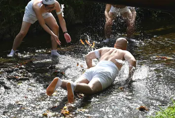 禊のふざけ 山間部の疎水は夏でも10度少々しかありません。裸祭りに参加する前の禊でふざけて騒いでいました。
