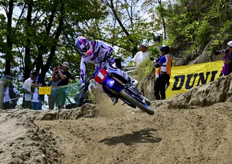 彼のゼッケンは昨年の彼の成果である。つまり全日本のナンバーワンライダーでる。この日の闘いでも、彼の走りは他をよせつけない。ダンロップヒルズからの下りも、ややノリノリでアクセルを開け過ぎて宙を舞ってしまつた車体も、高度な彼のライディングテクニックで無理やり押さえつける。まさに卓越した走りである。私のカ