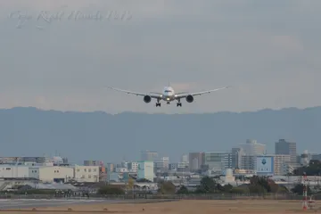 伊丹アプローチ。滑走路はあっち! 伊丹スカイランドHARADAからの撮影強い西風のため、着陸機がこちらに向かって一直線!普通なら「機体の左側面」を見せながら「画面の右上から左下方向にアプローチ」していく。で、思わず「ちゃうちゃう、滑走路はあっち!」と、叫びそうになる
