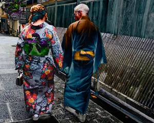 パラレルワールド(郷に入っては) ソラリゼーション的な表現で並行世界的な表現を発信。海外の方の京都観光の制服的な和装姿。