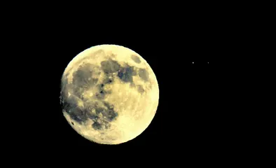 失敗した名月 今、仲秋の名月を撮影しましたが、下手くそで失敗です。どなたかにお任せします。月の右に点が2つあるのは自衛隊機の両翼です。