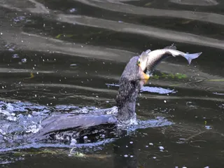 2025年10月中旬頃カワウ見れましたカワウの魚取っているところ写してみたいなあーと思いちょっと待っていると魚くわえたのですぐにカメラを向けて撮影しようとしたら他のカワウが魚を横取りしようと追っかけきたみたいです朝早いのでシャツタースピードをあまり上げれなかったですもうちょっとシャツタースピードを上