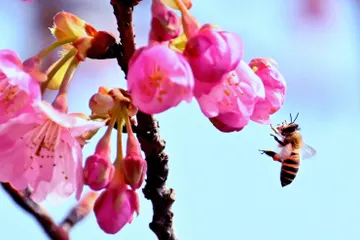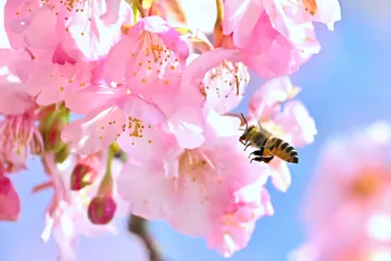見頃を迎えた河津桜。メジロを求めて撮影に行ったのですが姿が見えず、代わりに蜜を求めて飛び回っていた蜂を撮影しました。 Nikon Z9 NIKKOR100-400mm f/4.5-5.6 VR S + Z TC1.4x1/2500秒 f/8 ISO4000