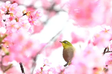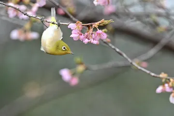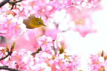 満開の河津桜とメジロ