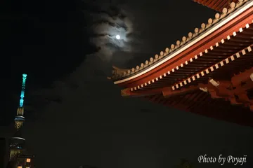 月見:浅草灯籠祭り(3) 10/5の浅草灯籠祭りで、浅草寺の隣にある浅草神社で催されたものです。10/5は、中秋の名月の前夜。浅草寺の境内から空を眺めた時、ちょうど月が雲の切れ間から顔を出したのですが、月に照らされた雲がちょっとおどろしく感じ、撮りました。こちらでは、10/6、10/7ともに曇りで、満月さえおがめないのが、残