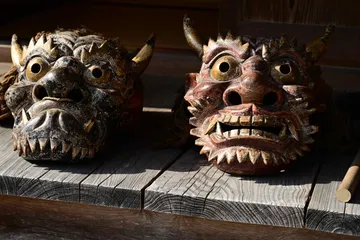 鬼面 冬と春との境目の節分に追儺式を行い、邪気を払って春を迎えるらしいですが、残っている鬼面も所によってお顔が違うので面白いですね。