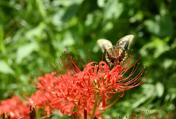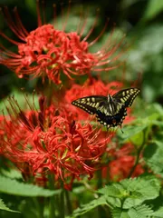 彼岸花にキアゲハ♀(メス) 先日、伊勢原市の日向薬師付近の彼岸花の名所で撮影しました。キアゲハ♀です。翅を広げた瞬間を撮影出来ました、