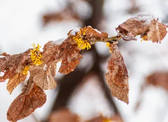 シナマンサク 雪ボケが撮りたくて出かけたところ、みぞれになってしまいました。ですが、美しい花が見れて本当に嬉しくなりました。