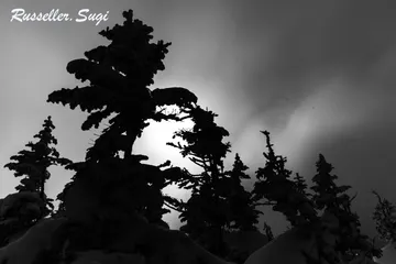 岩手のとある山域の山頂にて雪がついたアオモリトドマツを逆光で撮影してモノクロシルエットとした。 雪がついた変哲のない木が、まるで天使の看板のように見えた。捉え方ひとつで造形の変化が面白い。