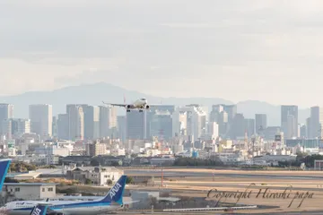 伊丹着陸機 大阪梅田のビル群を背にアプローチしてくる伊丹着陸機メラ(蜃気楼)の少ない日にのみ撮れるショット