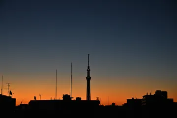 グラデーションが美しい朝焼けとまるで切り絵の様な素敵なスカイツリー都会の街並みですね~。ロマンチックな素敵な作品だと思います。お見事です。^^
