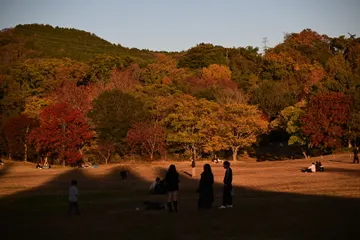 秋色の夕べ 徒歩圏内にある森林植物園の多目的広場に行くと、お天気も良かったせいもあり、小さいお子さんと戯れるご家族やまったり寝そべるカップルの姿がありました。カメラを手にした私も秋を満喫してきました。