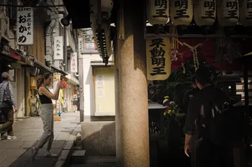 NEW 静の花、動の視線 千日前法善寺にて。お不動さんの静寂、法善寺横丁の路地とスマホを構える女性を柱で左右非対称な構図にしてみました。彼女のスマホ(視線)の先にはかすかに光があたる花。二つの世界が繋がったような、そんな写真になった?(ホンマに?)という一枚です。NIKON D7000 + SIGMA Art 30mm F1