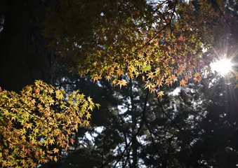 静かなる影と、歓喜の紅葉 日の出とともに訪れた、愛知・寂光院。木々の間から差し込む光が、建物を照らし、紅葉の色を一層鮮やかに見せてくれました。