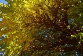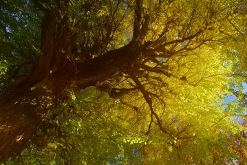 秋色チャレンジ」木漏れ日の銀杏 近所の神社で撮影した大きな銀杏の木です。黄葉が進み見頃になってきました。朝の光を透してまるで大きなトーチの様です。お気に入りの銀杏の木です。カメラ内合成をしています。