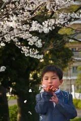 昨春に孫の小学校の入学祝で撮影。桜の花びらを吹いています。