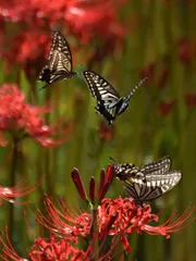 ラスト・チャンス(2) ナミアゲハ♂にとって♀を見つけて求婚する機会としては、メスが彼岸花にやって来るこの時期が1年の最後となると思います。必死に求婚するオスの姿、美しい彼岸花で待っている様な姿がとても美しい光景です。