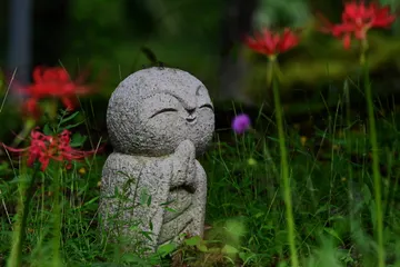 お地蔵さんも彼岸入り 今日は彼岸の入り、毎年のように撮っている小地蔵さんも花の様子はその年その年変わります。頭にトンボがとまっています。「お彼岸入りの彼岸花」とはよく言ったものです。